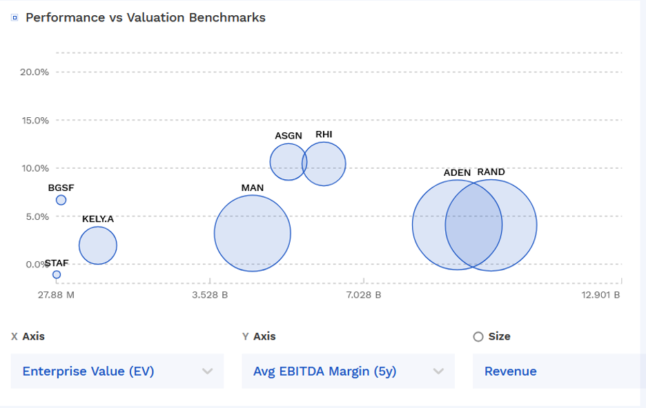 Come si può vedere dal grafico, ADEN e RAND, le società più grandi nel settore staffing con rispettivamente circa 7,4 miliardi e 7,8 miliardi di valore d'impresa, hanno avuto margini EBITDA simili negli ultimi 5 anni, intorno al 4%. Al contrario, ASGN e RHI, con metà del valore d'impresa, hanno entrambi margini del 10,5%.