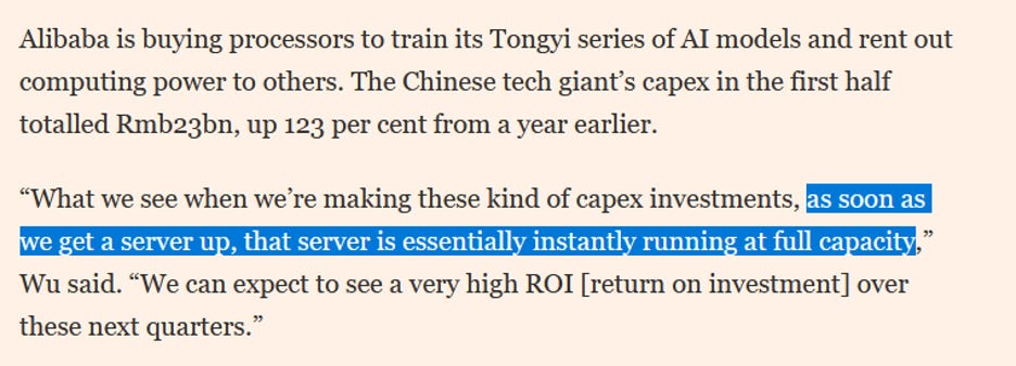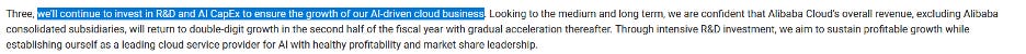Come spiegato nel mio Q1 update (https://investitoreintelligente.substack.com/p/q1-2024-update), Alibaba si trova in una posizione di forza quando si parla di Cloud e AI, grazie agli investimenti fatti in passato sulle schede grafiche.