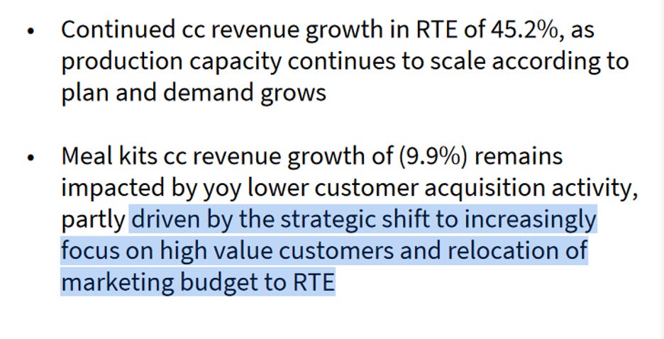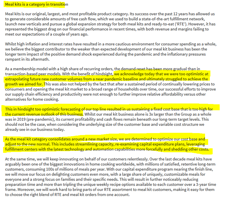 Nella lettera agli investitori (https://ir-api.eqs.com/media/document/c67787e4-d900-4161-a098-a69fe591ab99/assets/DE000A161408-Q2-2024-EQ-E-00.pdf?disposition=inline), il management ha riconosciuto i propri errori. In passato, si basavano sui dati del 2020, che mostravano una crescita esponenziale dovuta al lockdown. In base a quei dati e con limitazioni nella capacità produttiva, non sono riusciti a soddisfare la domanda per i meal kit. Per questo motivo, hanno deciso di investire pesantemente nell'ampliamento della capacità produttiva, portandola fino a €10 miliardi, aspettandosi un mercato altrettanto grande. Tuttavia, il mercato attuale si attesta intorno ai €7 miliardi, richiedendo investimenti maggiori in CapEx. Inoltre, hanno destinato una somma significativa di liquidità al marketing dei meal kit per attirare nuovi clienti. Tuttavia, il management ha riconosciuto che il mercato dei meal kit potrebbe essere giunto a maturazione e che esistono diverse tipologie di utenti. Le famiglie con un reddito più elevato possono permettersi il sovrapprezzo di un servizio come quello dei meal kit, mentre le famiglie con redditi medi o bassi, a causa dell'inflazione e dell'aumento dei prezzi, non hanno rinnovato il servizio.