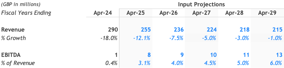 Ipotizzando uno scenario di stabilizzazione del fatturato intorno a £215 milioni e un margine EBITDA a lungo termine del 6%, il valore del titolo è di circa £1,50 per azione, che rappresenta un potenziale upside del 200% rispetto ai livelli attuali.